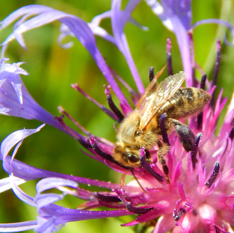 Unsere violetten Blüten wie Astern, Tellerhortensien, Kornblumen, Flieder, Christrosen, Schmuck-körbchen und Wicken werden gerne von Bienen, Wildbienen, Schmetter-lingen und Schwebliegen besucht.